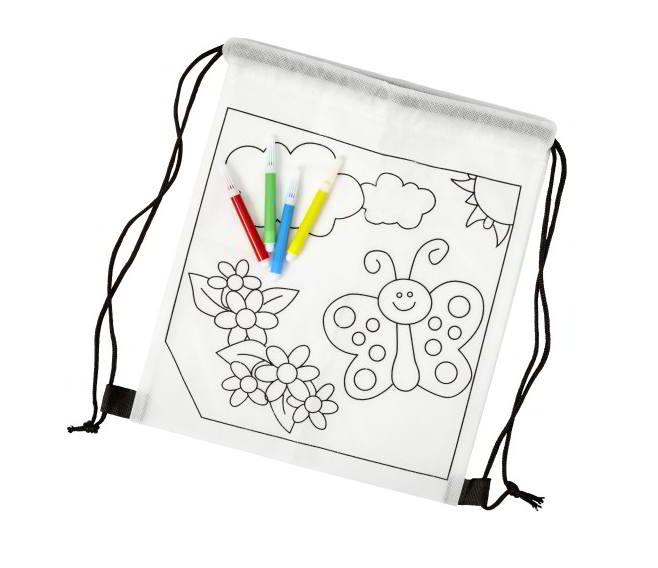 Rugtas van polyester die is voorbedrukt met een kleurplaat. De 4 stiften worden meegeleverd. De kinderen zullen hier vast veel plezier aan beleven! De rugtas heeft een afmeting van 30 x 25 cm. De andere zijde van de rugtas is blanco. Hierop kunnen wij uw logo bedrukken. Deze rugtas met koordjes wordt veel gebruikt door kinderen van de basisschool.