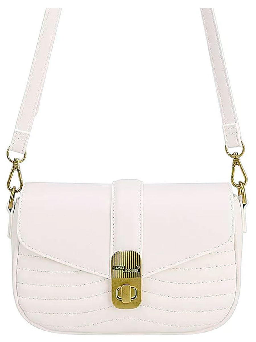 Deze trendy ecrukleurige schoudertas heeft een leuk doorgestikt patroon aan de voorkant. De tas heeft een verstelbare en afneembare schouderband met een draai- en ritssluiting.