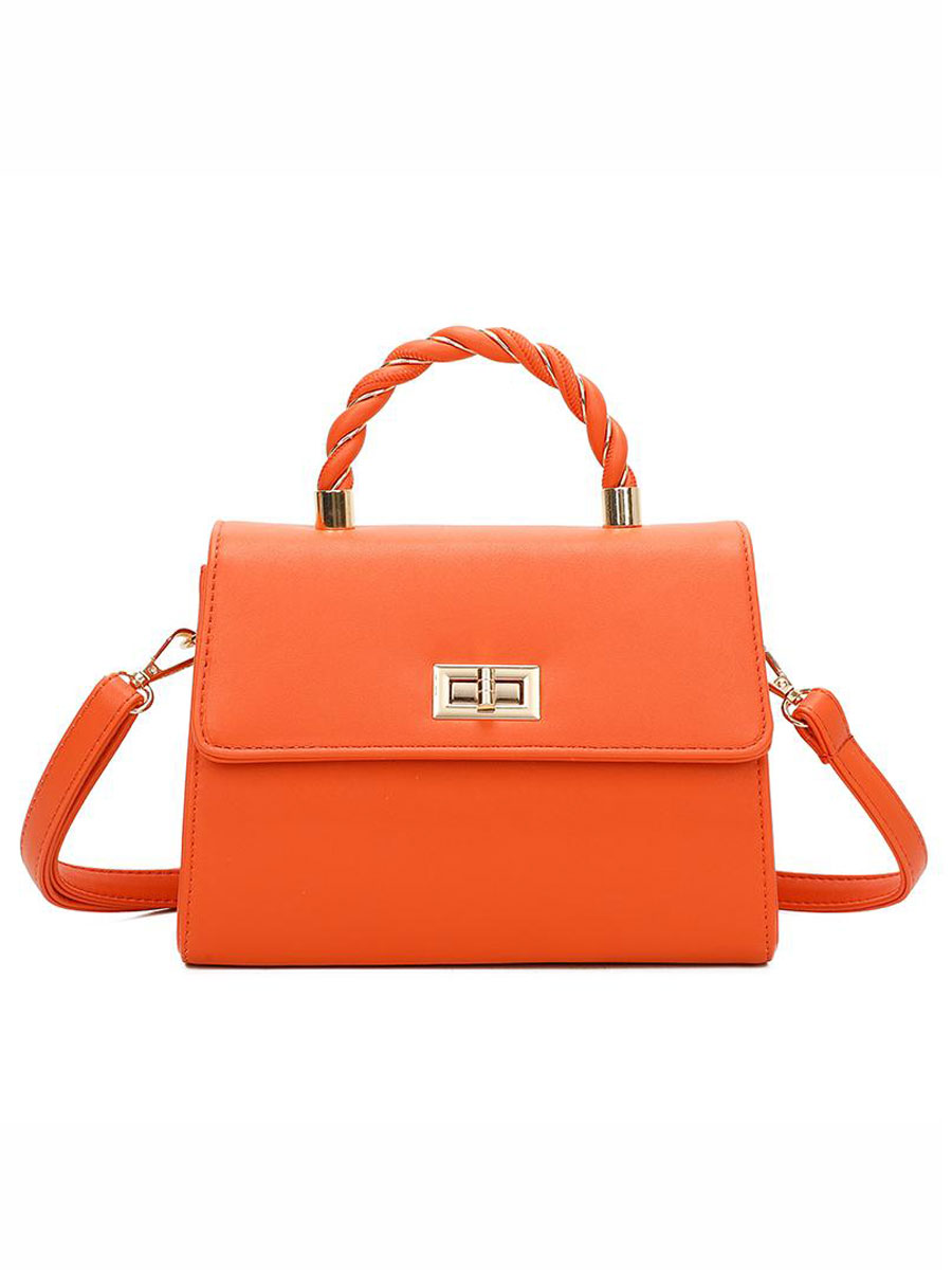 Deze mooie oranje schoudertas heeft een gedraaid handvat met goudkleurig detail. De tas heeft een verstelbare en afneembare schouderband zodat je hem ook als handtas kan dragen. De tas sluit met een draaiknopsluiting. Binnenin heeft het een open vak en ritsvakje.